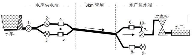 2 、 圖中 1 号閥門(men)和 2 、 3 号閥門相(xiàng)距 20m 左右; 2 号閥(fa)門和 4 号電磁(ci)流量計相距(jù) 15m 左右, 3 号閥門(mén)和 5 号電磁流(liu)量計也相距(ju) 15m 左右; 6 号電磁(cí)流量計和 7 号(hào)閥門相距 20m 左(zuǒ)右,中間有個(gè)水平 90° 的直角(jiǎo)彎, 7 号閥門後(hòu)面是高約 8m 的(de)過濾塔; 9 号閥(fá)門爲水廠備(bei)用管道,爲常(chang)閉狀态;